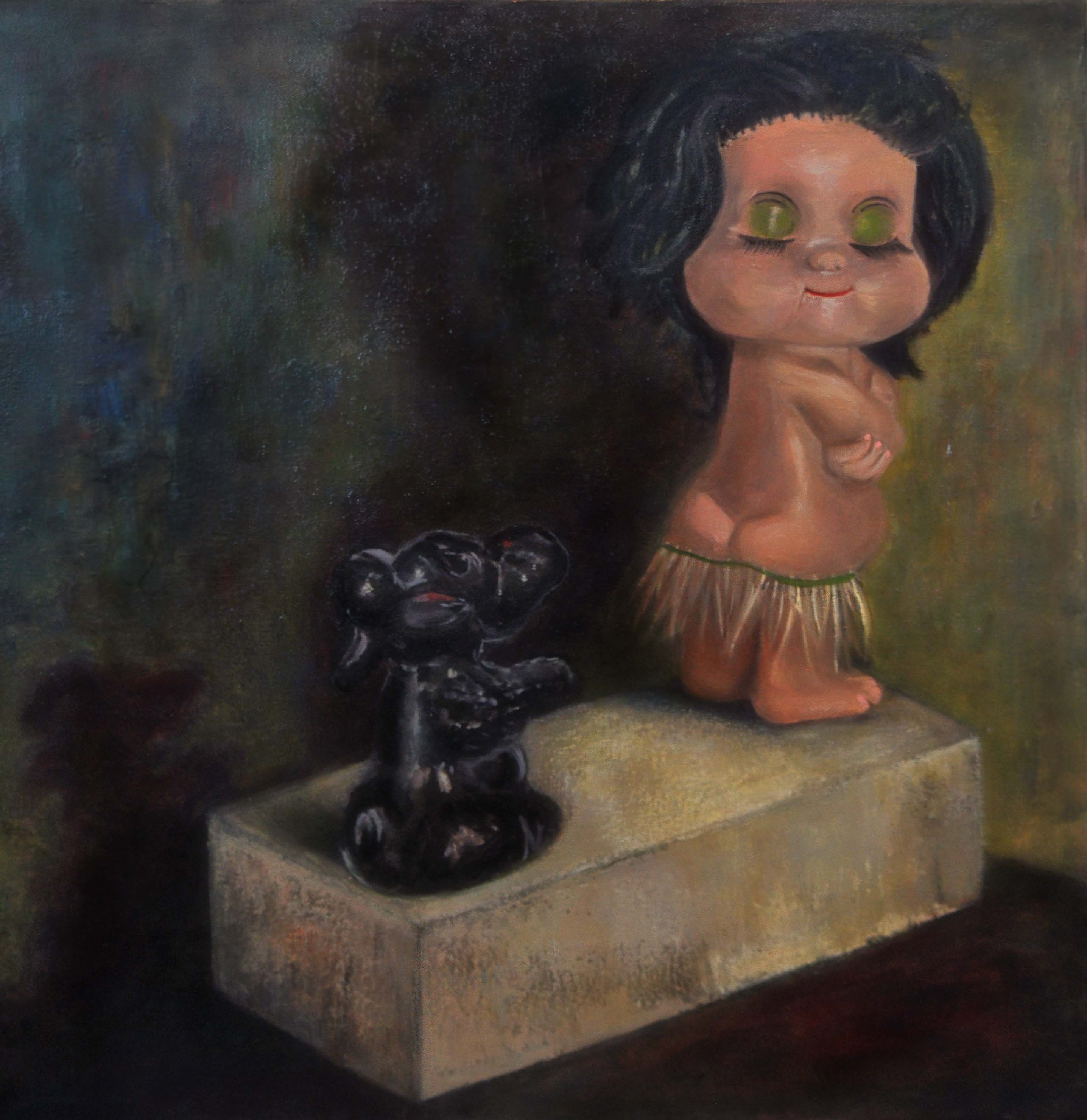 A misappropriated menagerie of items: a puppet, a porcelain doll, a sewing box, a brass bell, an iron parrot – remnants of my childhood where dysfunction is the family heirloom. These objects are combined with abstract elements, integrating still life and abstract expression, recreating childhood scenarios.