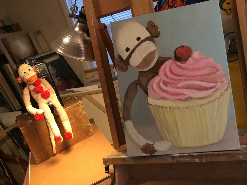 #cupcakes #sockmonkeys #vintagesockmonkey #oiloncanvas #inthestudio #paintinginthetimeofcovid