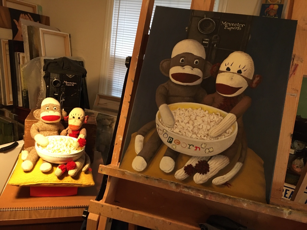 #pandemic #fightorflight #inthestudio #workinprocess #wip #oiloncanvas #sockmonkeys #vintage #stilllife #popcorn