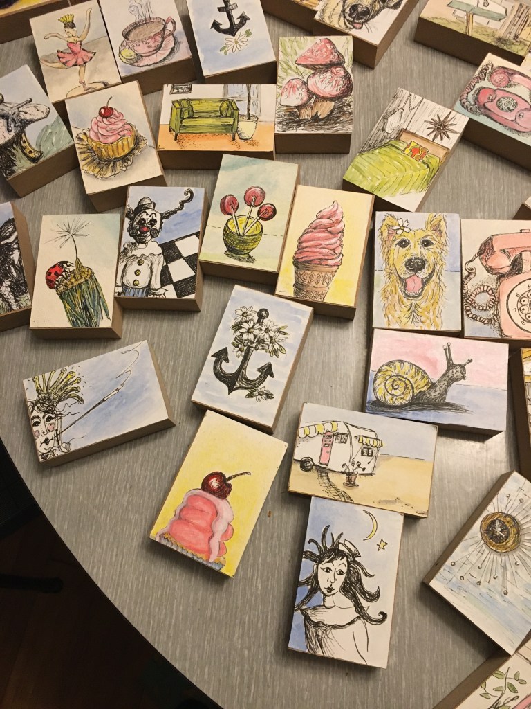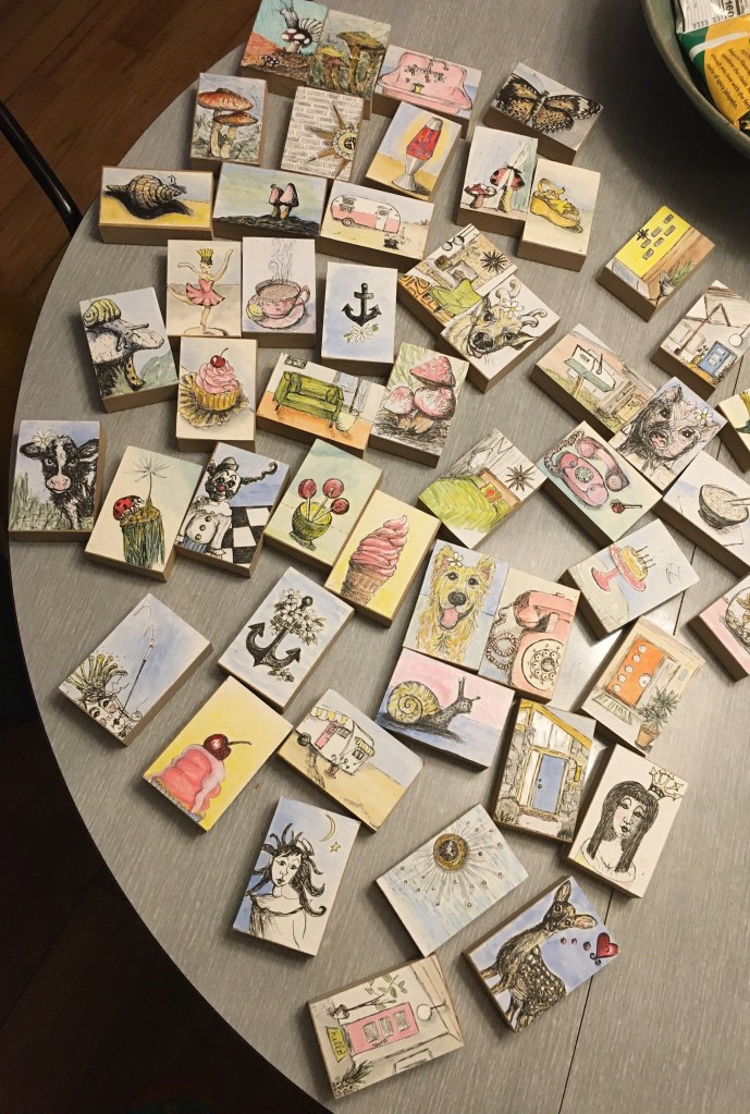 When I’m finished obsessing over my designs, I cut them to size and glue them to the wooden art-o-mat blocks. Then I glue my business cards to the back, so art-o-mat collectors can contact me for commissions, etc. Then I wrap each of them with the cellophane (hence the name Artists in Cellophane.)