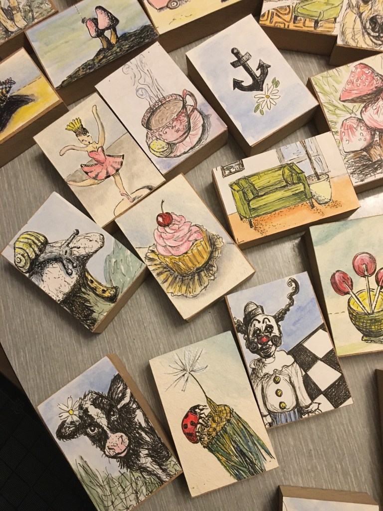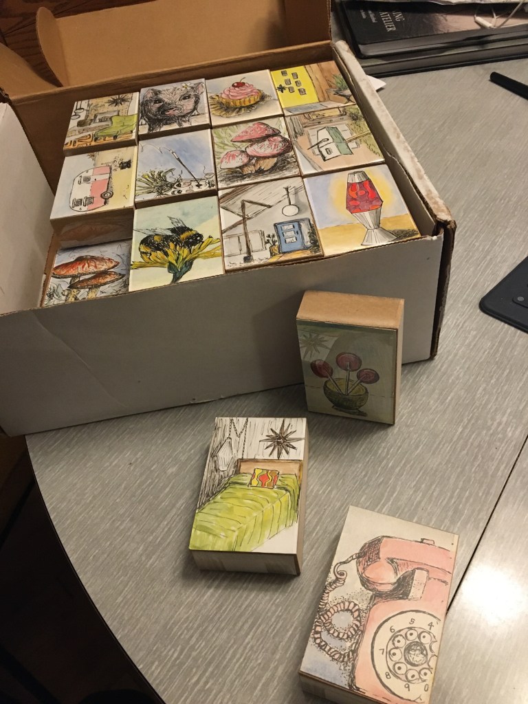Produce your 50 pieces of original artwork according to the Art-o-Mat guidelines. I make tiny pen and ink drawings and this time I’ve added acrylic paint wash. I decided to do sort-of a mid century/vintage vibe with campers, pink princess phones, mushrooms, etc. (The first batch I did were tiny, full-color, detailed still life paintings of random little objects and I called it “Lily’s World.”