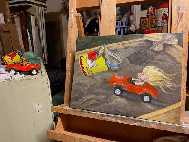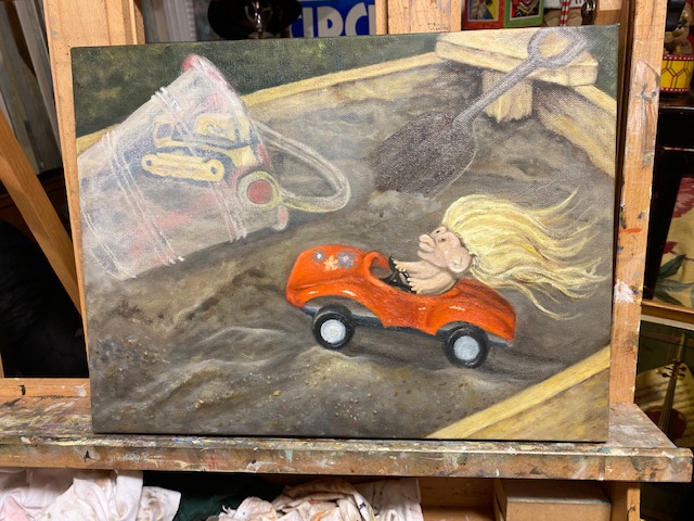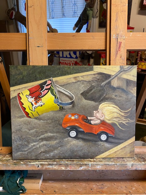 Paintings usually evolve over time. This one I started quite a while ago, set it aside to finish up some commissioned paintings, and now I’m back to it. Here are some in-process shots of this Troll having the time of his life in the sandbox…