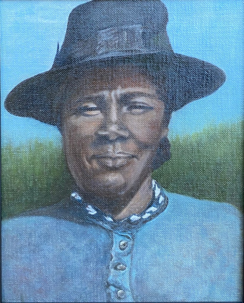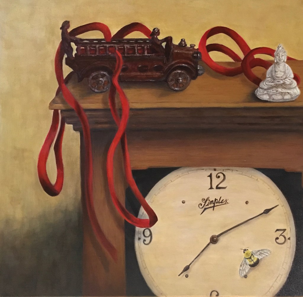 Tremont – While making this painting I used photo references and watched and re-watched a video of the house several times. As I painted, I felt like I was in their yard for weeks – in the warmth of the sun and the sunny yellow house, among the lovingly placed and planted sculptures, stones, shrubs, flowers, from years of making this house a home.