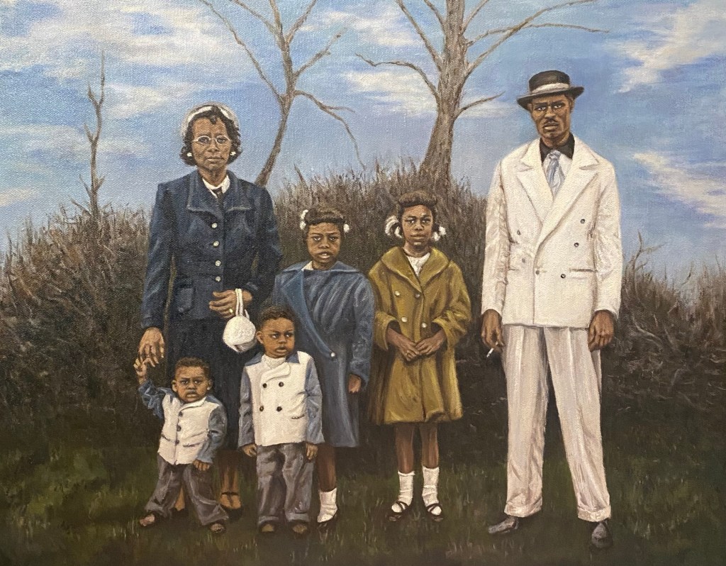 I translate a black and white photo into a color portrait in oil paints – bringing the soft colors of the time, like a bathing suit and towel, back to life and adding the blush to her skin, flushed from the warmth of the summer sun
